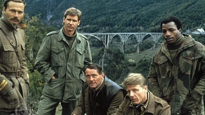 Le film d’Hamilton reprend après le récit des CANONS DE NAVARONE : Après une mission périlleuse sur l’île de Navarone, le major Mallory et le sergent Miller, membres d’un commando des forces américaines, doivent se rendre en Yougoslavie afin d’y éliminer un traître au service des Allemands. Mais l’avion qui les transporte est touché par un obus et contraint à se poser de toute urgence. Les deux hommes sont alors capturés par l’ennemi mais, décidés à mener à bien leur mission, vont tout mettre en œuvre pour s’évader et rejoindre la Résistance. En coulisses, c’est également la guerre, surtout entre Harrison Ford et Guy Hamilton qui ne s’entendent pas du tout. Le premier admettra avoir accepté ce rôle pour l’argent et pour le sortir de la « Han Solo mania ». Le second n’apprécie guère le jeu d’acteur de Ford et menace de le couper au montage s’il ne fait pas mieux. Le studio s’en mêle et calme le jeu : Harrison Ford est désormais une vedette donc un argument commercial pour la sortie du film. L’acteur avouera plus tard avoir vécu là l’un des pires tournages de sa vie…